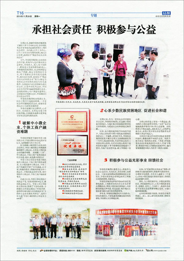 華春集團(tuán),以創(chuàng)造更多財富讓更多人分享的崇高使命和強(qiáng)烈的社會責(zé)任感,得到各級黨政和社會各界的首肯。本周,晨報以《承擔(dān)社會責(zé)任 積極參與公益》為題,又用一個整版對華春的善舉進(jìn)行了大篇幅的報道。