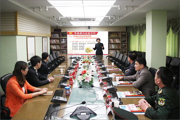 王獻(xiàn)斌大校一行首先參觀了華春集團(tuán)文化中心,集團(tuán)副總裁高青就華春企業(yè)文化的核心理念、主要產(chǎn)業(yè)、重大科研成果、發(fā)展戰(zhàn)略及前景、企業(yè)榮譽(yù)、社會(huì)責(zé)任等進(jìn)行了介紹。在座談會(huì)上,高青重點(diǎn)闡述了華春企業(yè)文化的打造原則、以中華民族文化精華與現(xiàn)代意識(shí)相結(jié)合企業(yè)文化特質(zhì)的核心價(jià)值觀、企業(yè)文化主題理念、企業(yè)經(jīng)營(yíng)理念及標(biāo)志釋義等。雙方就如何深刻學(xué)習(xí)掌握國(guó)學(xué)傳統(tǒng)文化精華、在當(dāng)代社會(huì)增強(qiáng)各族人民對(duì)祖國(guó)的認(rèn)同、對(duì)中華文化的認(rèn)同、踐行社會(huì)主義核心價(jià)值觀的重要性等,進(jìn)行了熱烈的討論交流。集團(tuán)總助王錫輝與企業(yè)文化中心主任藍(lán)泰彬、陳旭虎、華春小貸工會(huì)主席趙瑜等管理人員參加了座談。