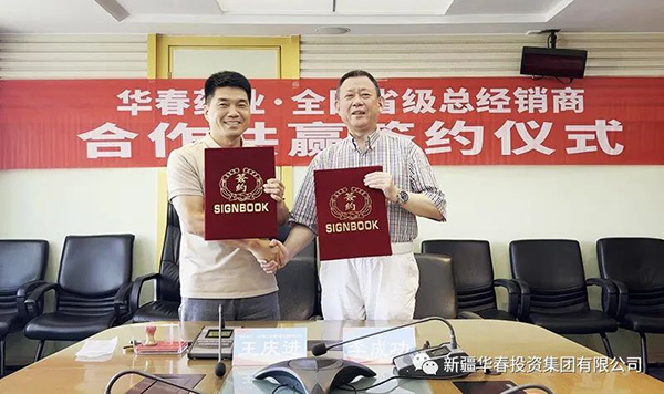 新疆華春生物藥業股份有限公司(簡稱華春生物藥業)與第二批全國省級總經銷商合作協議簽署儀式,于8月24日在新疆華春投資集團舉行。新疆華春投資集團董事局主席兼總裁、華春生物藥業董事長李成功先生,分別與江蘇龘龍醫藥科技有限公司研發負責人張永昌(江蘇省代)、北京麥爾信康科技發展有限公司總經理王慶進(北京省代)、河北思平生物醫藥科技有限公司總經理高春雨(河北省代),簽訂了《“參葛補腎膠囊”推廣服務協議暨省級總經銷協議》。華春生物藥業相關技術與管理人員參加簽署儀式。
