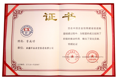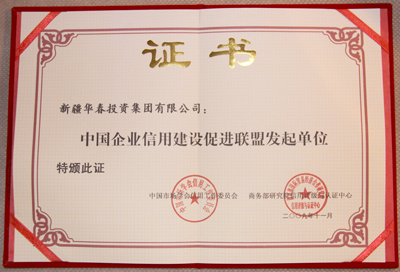 華春投資集團(tuán)被評為最高信用等級即AAA①級的誠信企業(yè),頒發(fā)了信用等級證書,并出具了信用等級評估報(bào)告。同時(shí),華春投資集團(tuán)被商務(wù)部研究院信用評級與認(rèn)證中心定為中國企業(yè)信用建設(shè)促進(jìn)聯(lián)盟發(fā)起單位,總裁李成功先生被定為中國企業(yè)信用建設(shè)促進(jìn)聯(lián)盟發(fā)起個(gè)人。