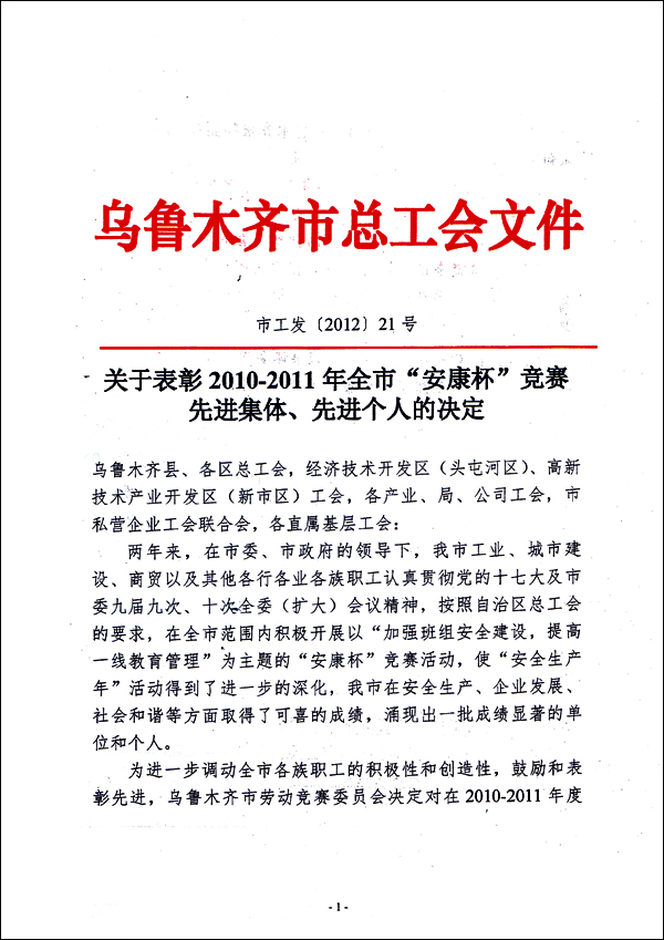 在剛剛結束的工會工作年度評比中,華春工會與華春工會主席高青被高新區(新市區)總工會評為“先進基層工會一等獎”、“優秀工會工作者”,同時榮獲由烏魯木齊市總工會、市安全生產監督管理局評定的“2010-2011年安康杯競賽先進集體”。