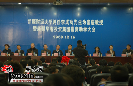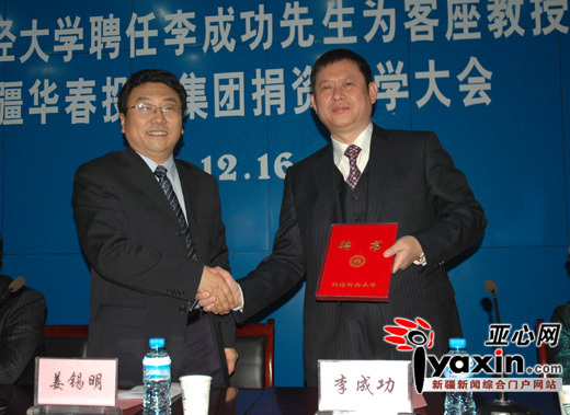 亞心網iyaxin.com訊(本網記者 邱鳴)12月16日下午,新疆華春投資集團董事局主席兼總裁李成功接受了新疆財經大學副校長姜錫明頒發的聘書,成為新疆財經大學客座教授。