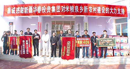 2008年的3月8日上午,盡管新疆大地春寒料峭,但在伊犁州察布查爾錫伯族自治縣米糧泉回族民族鄉(xiāng)卻是一派溫暖熱烈的景象:因?yàn)樵谶@里正舉辦著由自治區(qū)黨委農(nóng)村工作辦公室、自治區(qū)社會(huì)主義新農(nóng)村建設(shè)規(guī)劃領(lǐng)導(dǎo)小組和伊犁州黨委新農(nóng)村建設(shè)領(lǐng)導(dǎo)小組與新疆華春投資集團(tuán)有限公司共同主辦的向米糧泉鄉(xiāng)捐贈(zèng)40臺(tái)電腦和10萬(wàn)元現(xiàn)金的儀式,新疆華春投資集團(tuán)是首家向自治區(qū)社會(huì)主義新農(nóng)村建設(shè)工作給予大力支持的民營(yíng)企業(yè)。