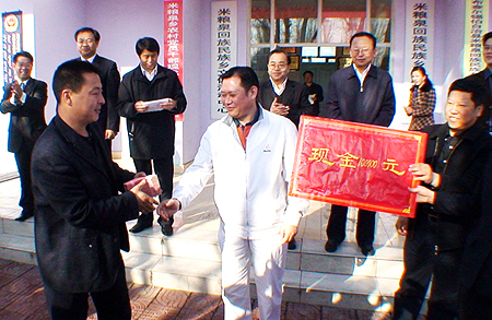 新疆華春投資集團(tuán)董事局主席兼總裁李成功先生親手將10萬(wàn)元現(xiàn)金交付于米糧泉鄉(xiāng)領(lǐng)導(dǎo)