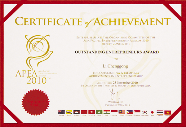 亞太企業(yè)精神獎(jiǎng)(APEA),即對(duì)亞太區(qū)域內(nèi)在建立成功企業(yè)過程中,以堅(jiān)毅精神取得卓越成就、并注重企業(yè)社會(huì)責(zé)任的企業(yè)家們給予的最高獎(jiǎng)項(xiàng)。此項(xiàng)評(píng)選活動(dòng)由亞洲企業(yè)商會(huì)組織主辦,獲得各國企業(yè)、商會(huì)及政府的支持,在亞洲印度、新加坡、馬來西亞、中國香港、印度尼西亞、文萊、越南、孟加拉國、泰國和中國等10個(gè)國家和地區(qū)進(jìn)行評(píng)選,致力于表彰全亞洲企業(yè)家中的精英,激勵(lì)更多創(chuàng)新,承擔(dān)社會(huì)責(zé)任,弘揚(yáng)企業(yè)精神。