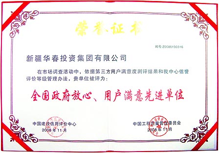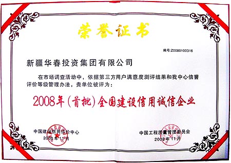 在不平凡的2008年即將逝去之時,新疆華春投資集團以其實際,贏得了相應的眾多榮譽:10月被中國質量信譽監督協會評為全國制造行業質量服務信譽AAA級單位;11月被中國建設信用評價中心、中國工程質量管理委員評為 “2008年(首批)全國建設信用誠信企業”和“全國政府放心、用戶滿意先進單位”,頒發了獎牌和證書(證書編號:Z0080100316)。